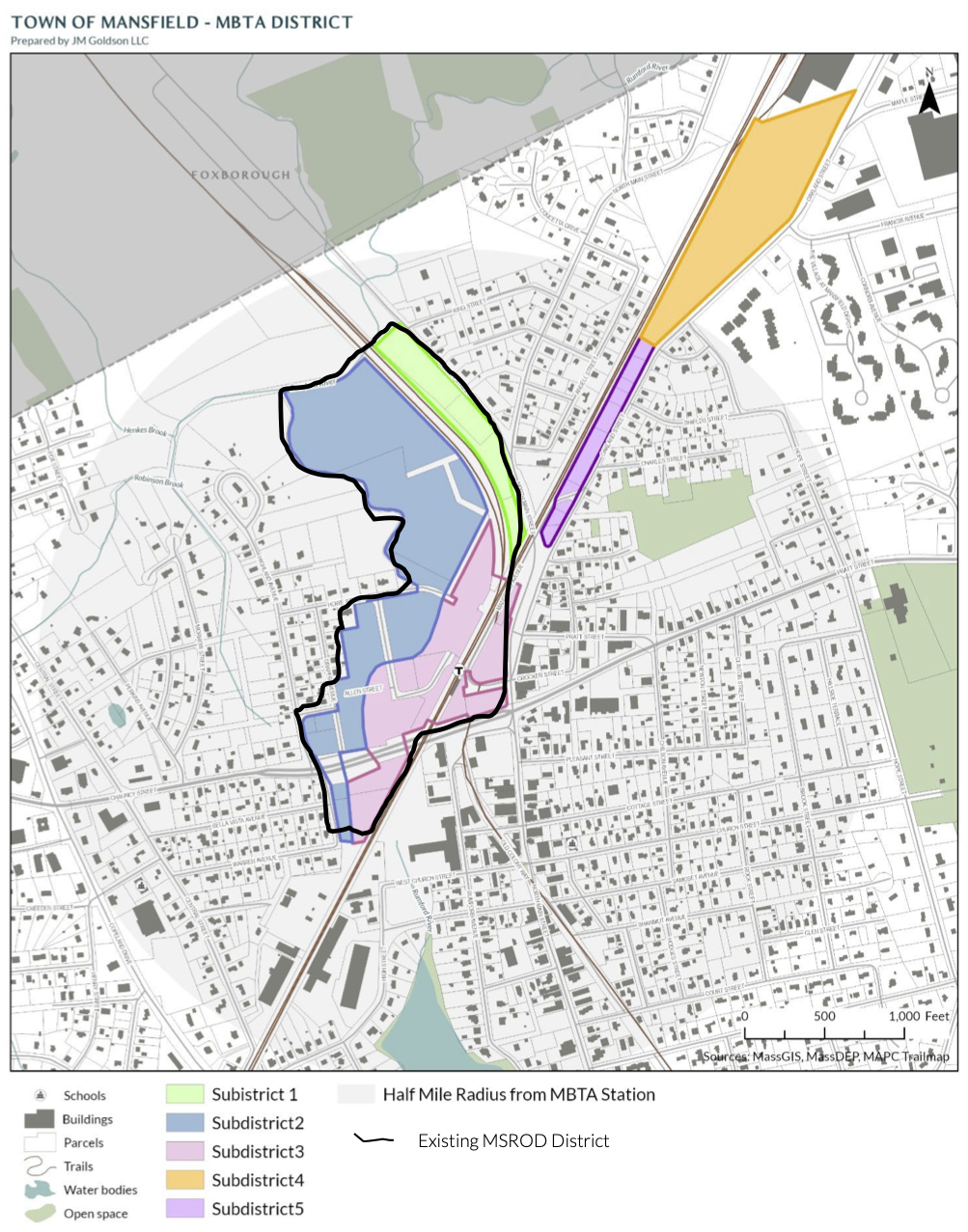 By 2023, Mansfield was in their second round of compliance modeling. They were navigating new technical guidance, ten overlapping subdistricts, and a noncontiguous zoning plan—all while aiming to meet the state’s requirement to zone for 1,392 multifamily units in at least 50 acres near the station.