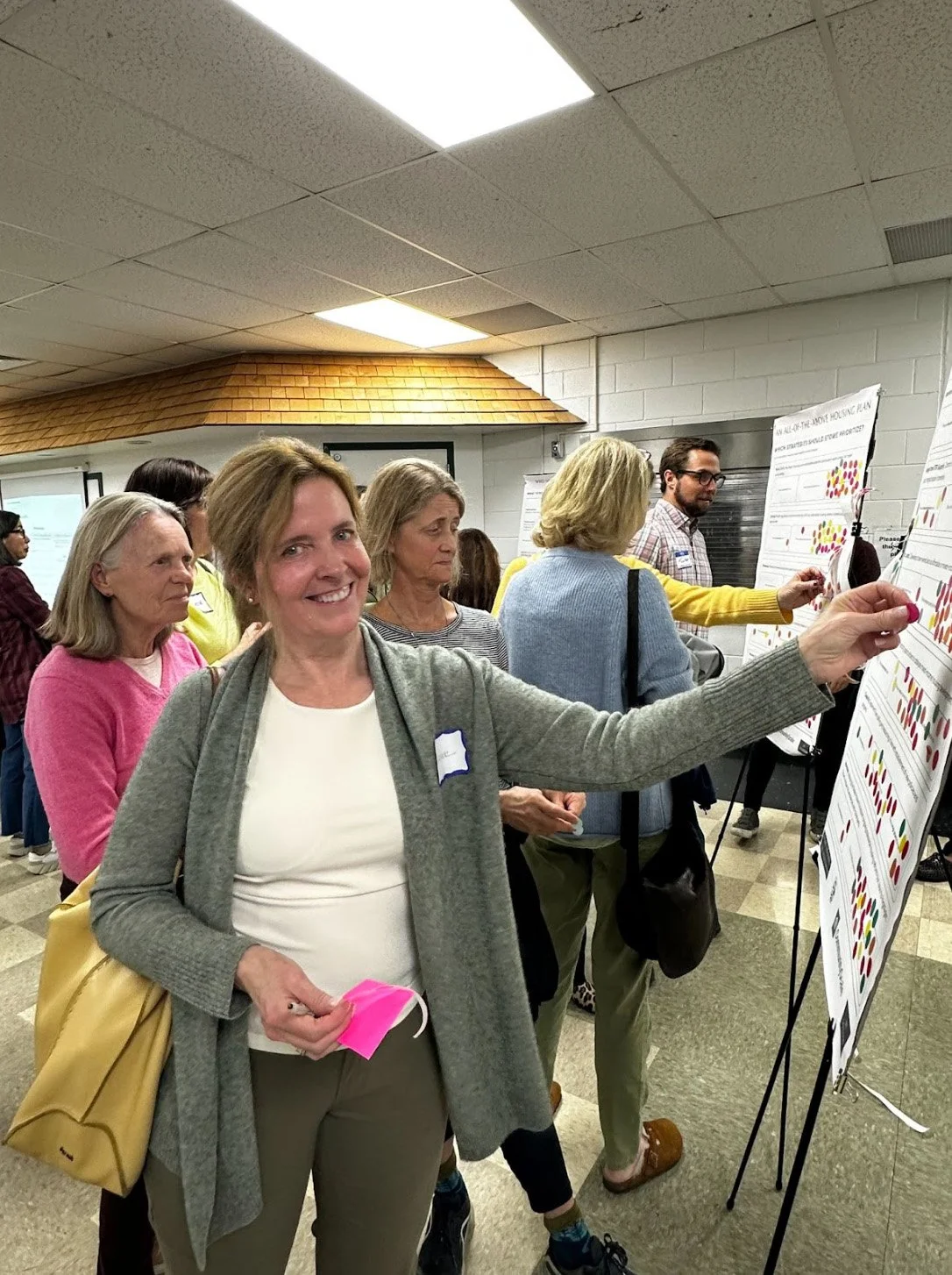 And Stowe delivered. Over 100 people packed the room at Stowe High School on a spring evening, far exceeding expectations. The atmosphere was vibrant with community members engaging in thoughtful conversations about housing needs and solutions. Attendees moved through a U-shaped layout of interactive stations we created, writing down their hopes and concerns, weighing in on housing strategies, and even placing dots on a map to show where new homes could go. It wasn’t just about input, it was about ownership, education, and connection.